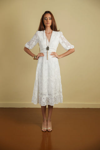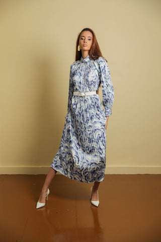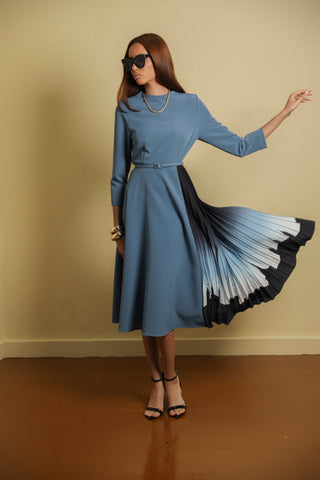 Midi Dress With 3/4 Sleeves With Pleated Detail And Waist Belt