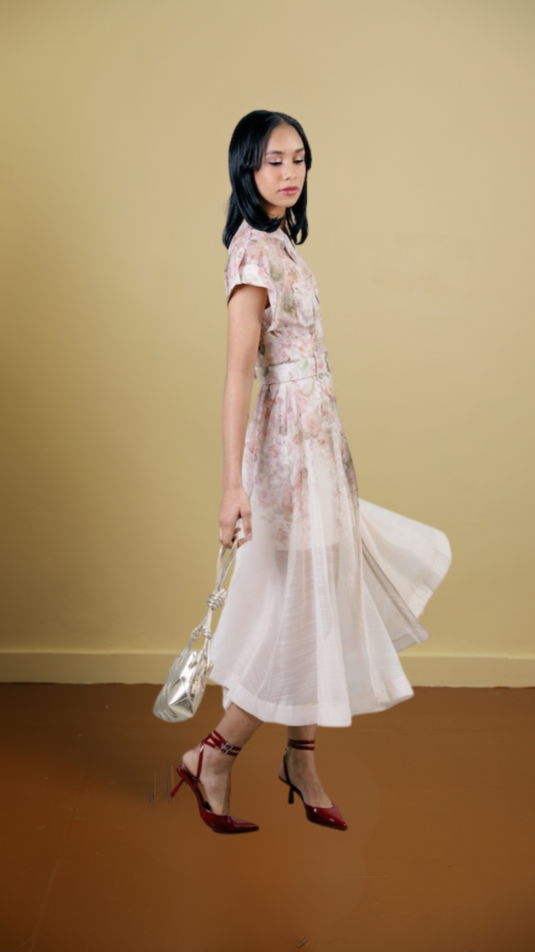 Organza Printed Midi Dress With Waist Belt